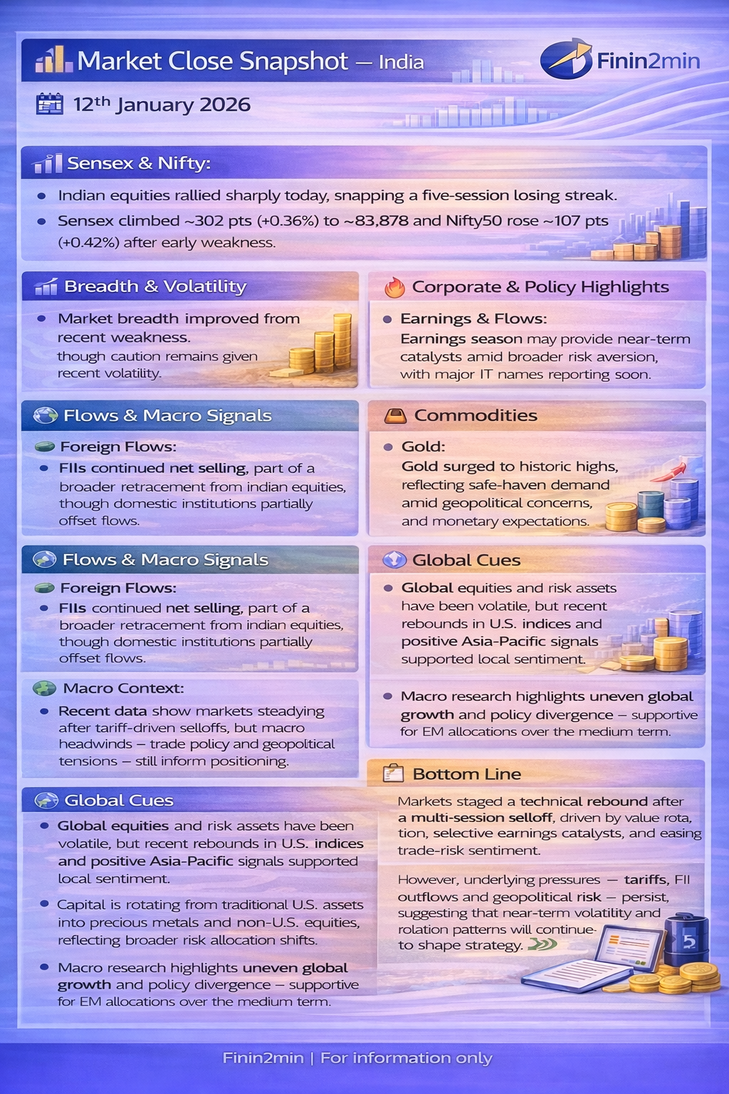 - Sensex climbed ~302 pts (+0.36%) to ~83,878 and Nifty50 rose ~107 pts (+0.42%) to ~25,790 after early weakness.