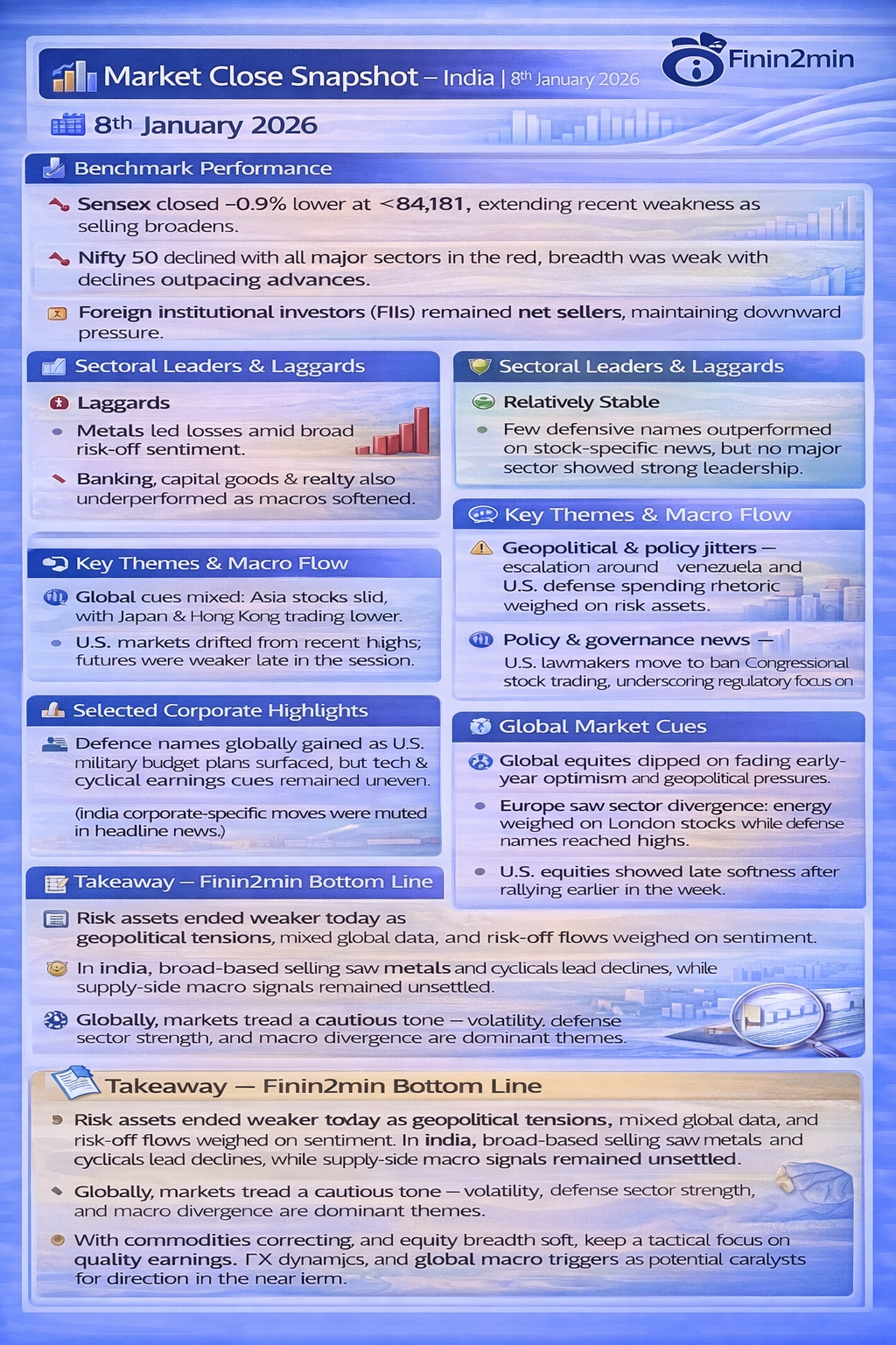 Risk assets ended weaker today as geopolitical tensions, mixed global data, and risk‑off flows weighed on sentiment. In India, broad‑based selling saw metals and cyclicals lead declines, while supply‑side macro signals remained unsettled. Globally, markets tread a cautious tone — volatility, defense sector strength, and macro divergence are dominant themes. With commodities correcting and equity breadth soft, keep a tactical focus on quality earnings, FX dynamics, and global macro triggers as potential catalysts for direction in the near term.