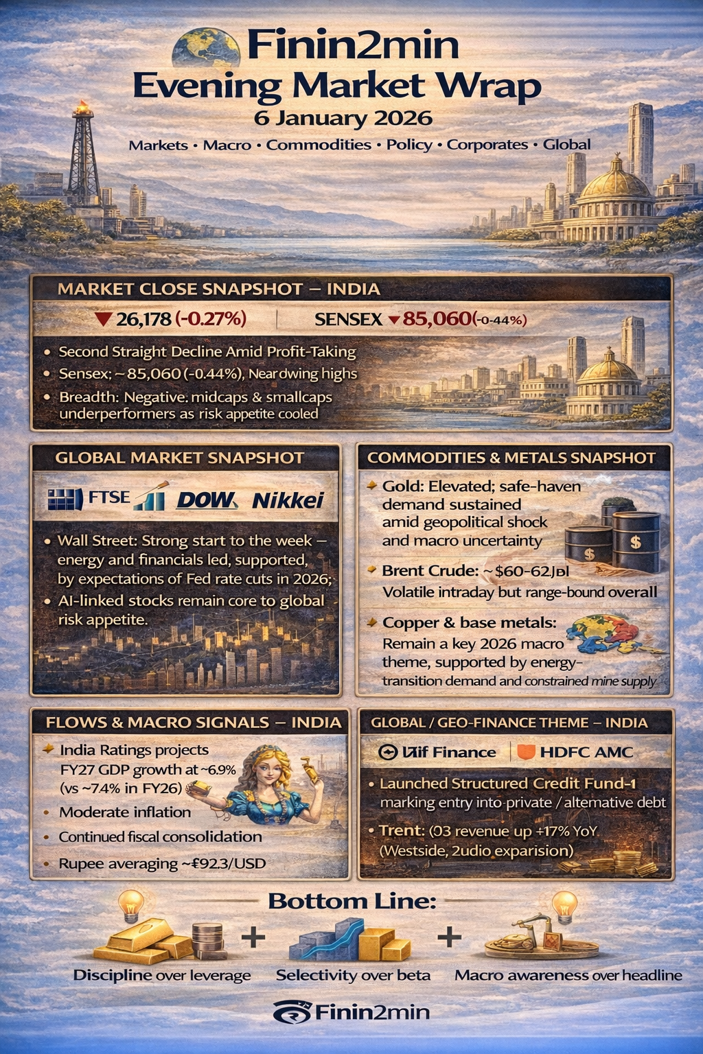 - Nifty 50: ~26,178 (β0.27%) β second consecutive down day as profit-booking emerged near record highs.