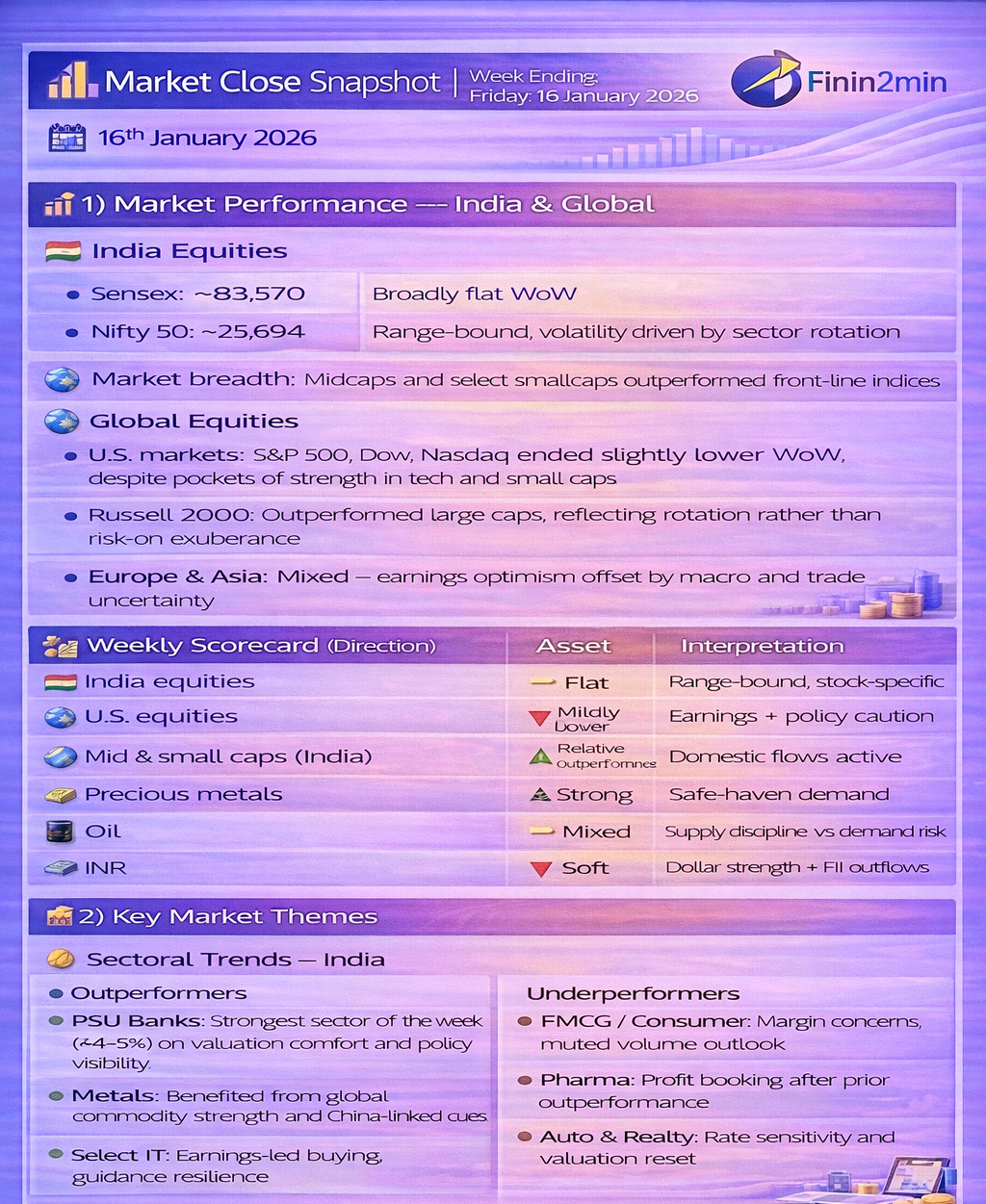• India: Flat indices masked sharp sector rotation โ€” PSU banks, metals, and selective IT outperformed