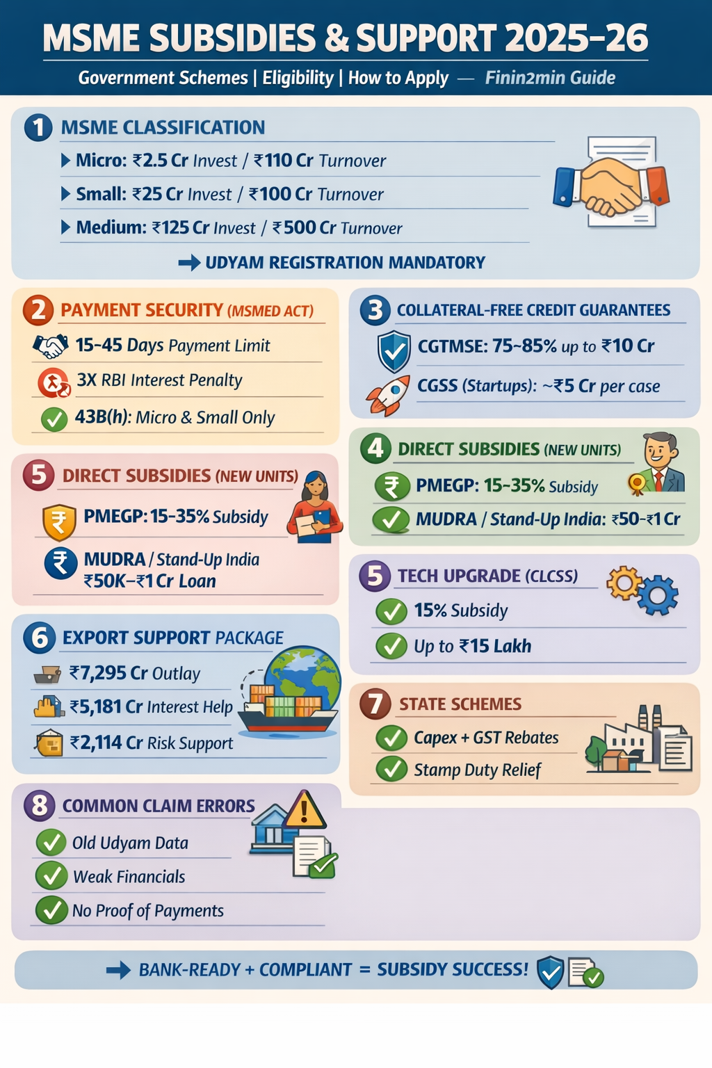 Micro, Small and Medium Enterprises (MSMEs are the backbone of Indiaβs economy, contributing ~30% to GDP and ~45% to exports. To strengthen MSME cash flow, credit access and competitiveness, the government has created a layered support ecosystem spanning MSME law, Income-tax, GST, credit guarantees, subsidies and export support.