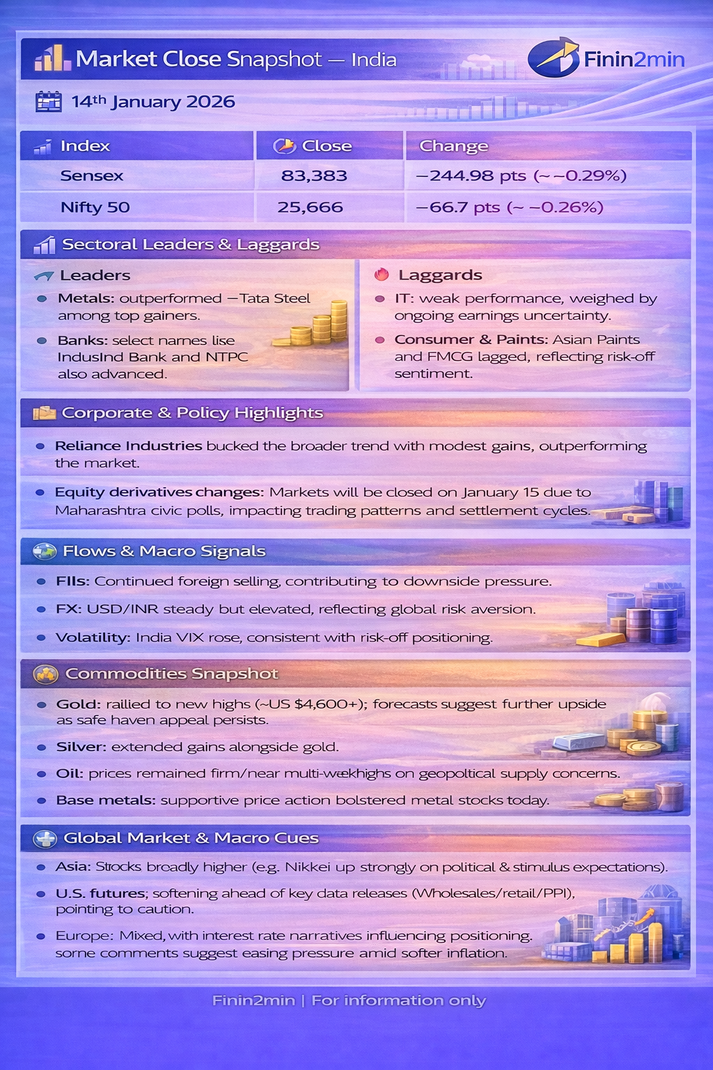 Today’s session reflected investor caution and sector rotation — benchmarks dipped modestly while commodity‑linked sectors outperformed and IT lagged. Markets are watching global macro activity, earnings clarity and geopolitical risk, with safe‑haven assets (gold/silver) still in strong demand. The broader view suggests a range‑bound Indian market with selective opportunities aligned to commodities and domestic stories, against a backdrop of elevated global uncertainty.
