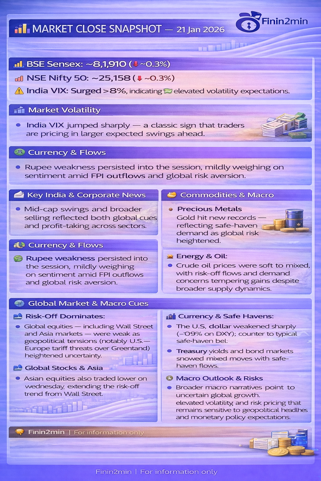- Geopolitical tensions and tradeโrelated fears triggered broad selling, pushing Indian benchmarks lower for a third day and lifting volatility gauges.