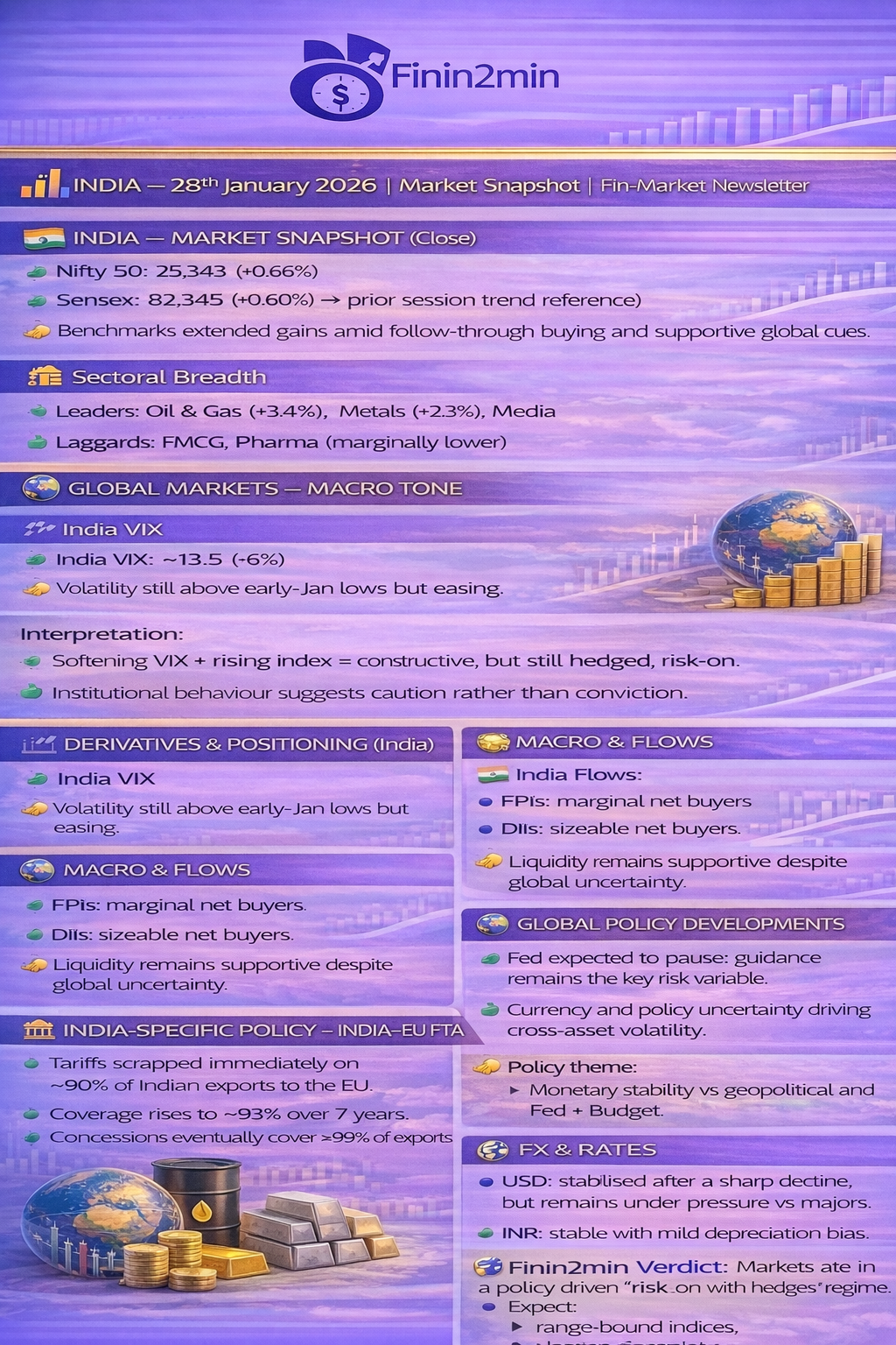 • Indiaโ€“EU FTA sentiment driving domestic equities.