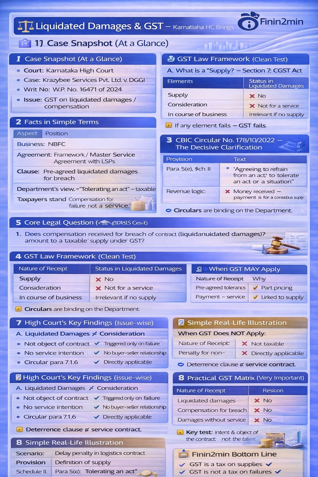 Liquidated damages are compensatory, not taxable. Unless money is paid for a conscious supply, GST has no role to play. GST taxes performance — not breach.
